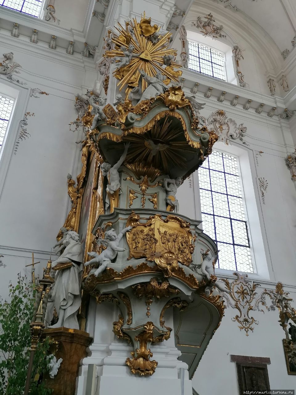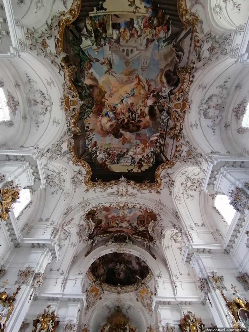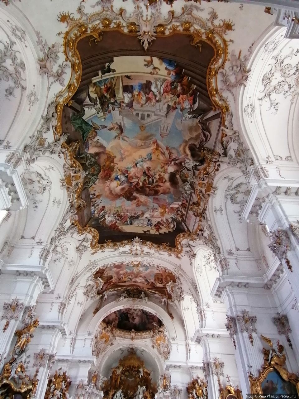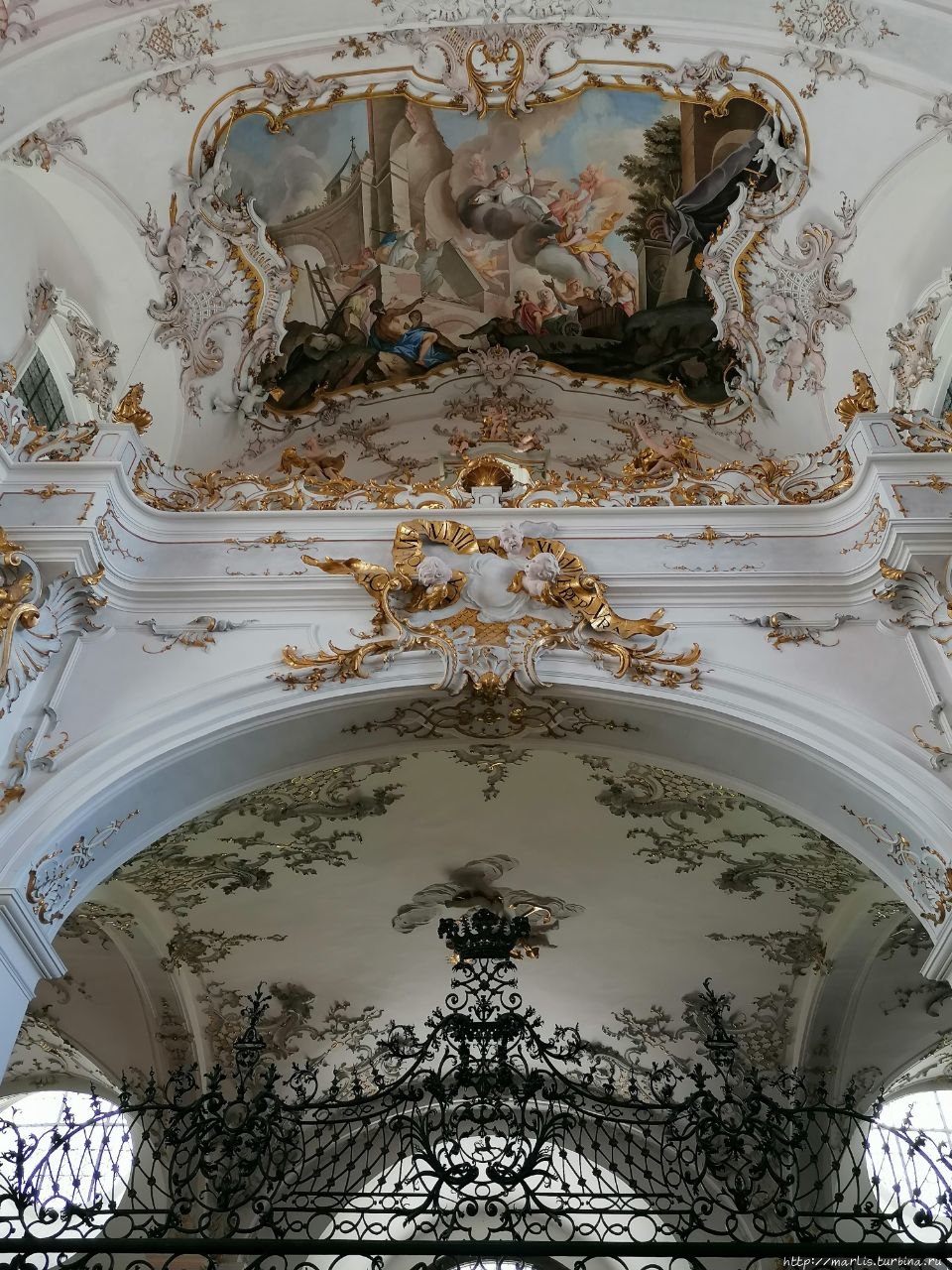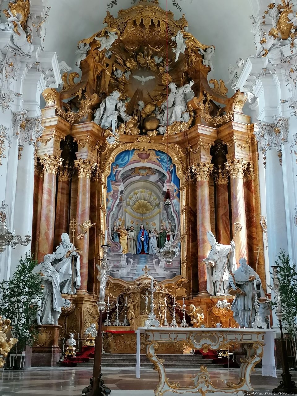 Внутренней отделкой храма занимались мастера Вессобрунской школы, в том числе братья Файхтмаер.