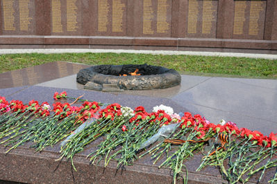 Перед монастырём высится памятник воинам-защитникам Св. Борису и Глебу, сидящих на