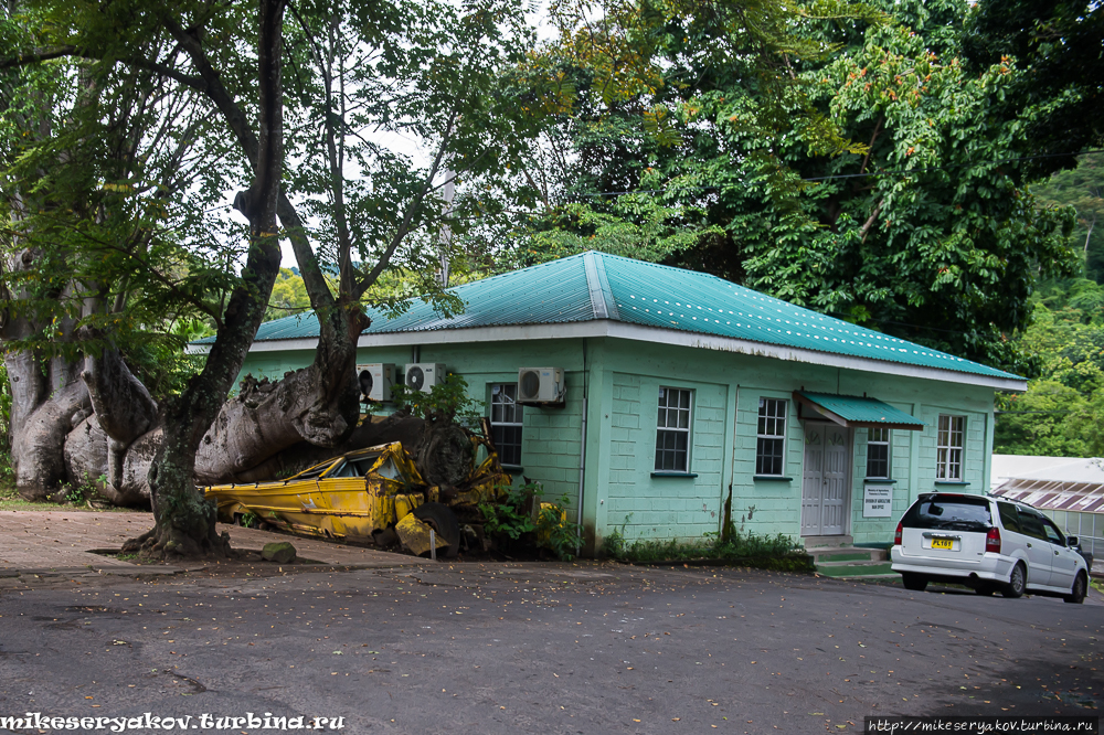Ураган, который был на острове, унёс много жизней. В ботаническом саду в столице Розо оставили школьный автобус, на который упало дерево.