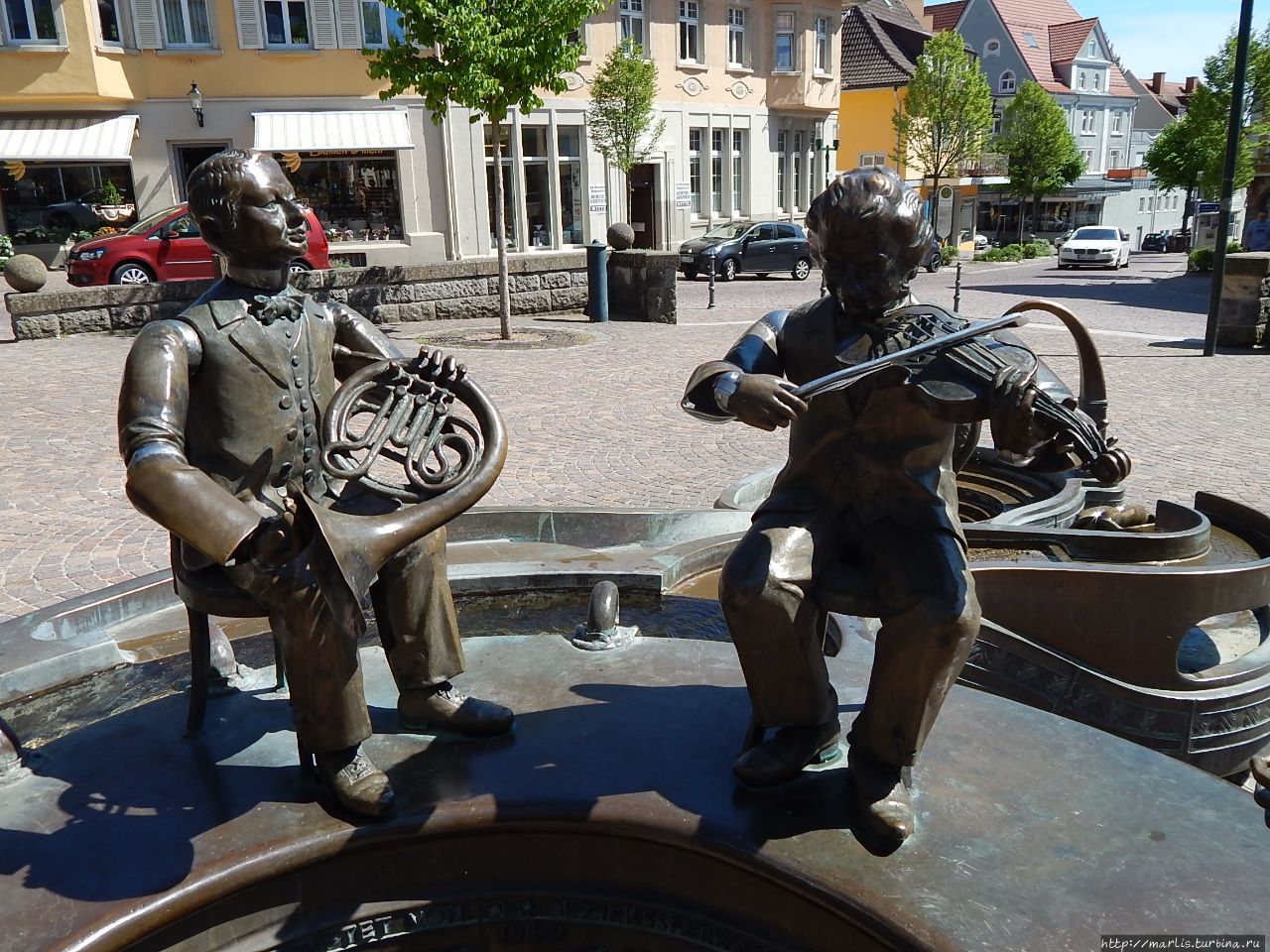 Кроме такого крупного мероприятия как "Дни музыки", в резиденции Фюрстенбергов или в парадном зале ратуши проходят циклы камерных концертов. К одному из этих циклов — "Шубертиане" — обратился скульптор Штирнберг, задумывая фонтан. Мы видим исполнение "Форельного квинтета" Шуберта.