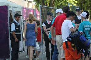Чтобы попасть в фанзону, нужно пройти через охрану — обыскали , забрали воду, моему фотоаппарату сделали комплимент. сказали, что с профессиональными камерами нельзя, но фотик, увы, на профи не тянет.