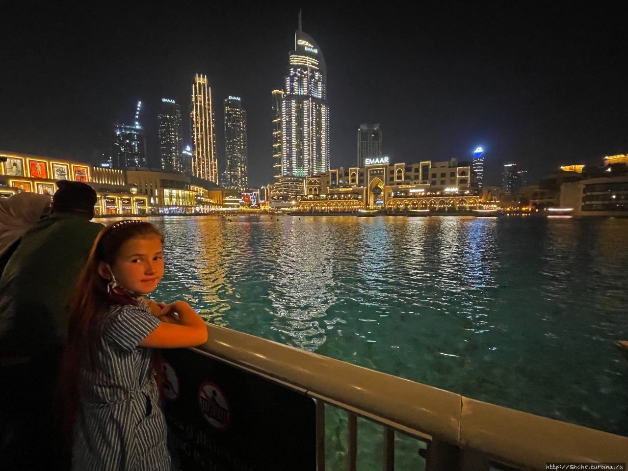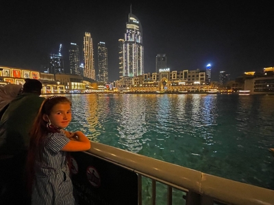 Ужин в стиле "дифлопе". Дубайский вариант, во время которого трижды наблюдали шоу Поющих фонтанов (правда не слыша "пения")Сейчас же мы на башню не поднимались, но шоу фонтанов внучке продемонстрировали... Вот что значит наслаждаться моментом!!!