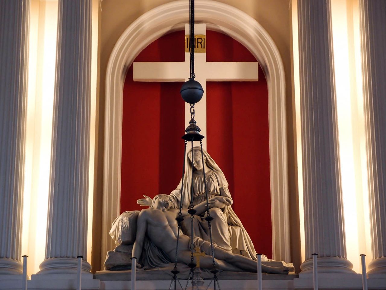 В алтаре, в окружении белых ангелов, возвышается скульптурная композиция «Пьета», работы Джона Хогана. Скульптура лишь слегка подсвечена, но игра света и теней поражает продуманностью!