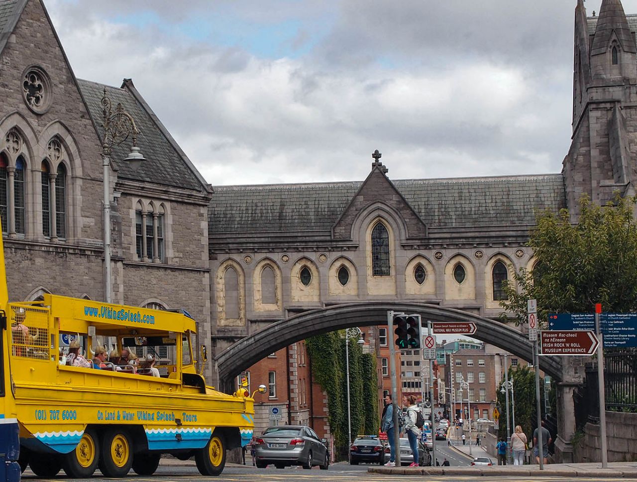 Эти автобусы, напомню, ходят в Дублине наряду с обычными «сити-турами». Однако, жёлтый автобус имеет форму корабля, а пассажирам раздают рогатые шлемы. В определенный момент «викинги», явно по команде, издают боевой клич, распугивая незадачливых прохожих.
