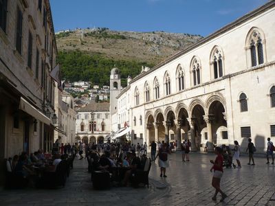 По улице Святого Доминика выходим на площадь Ложа. Здесь стоит один из наиболее красивых дворцов Дубровника – Дворец Спонца. Построен дворец в 1521 году архитектором Паское Милицевичем сразу в двух стилях – готики и ренессанса. Здание на протяжении веков служило таможней, монетным двором, академией, казначейством. Сейчас здесь архив, где собраны ценнейшие документы из жизни города. Самый старый документ датируется началом XI века. С 1278 года сохранились все документы в политических, дипломатических, экономических, морских, торговых и судебных сферах делопроизводства. В 1667 году дворец сильно пострадал во время землетрясения, восстанавливали его в течение 30 лет. Кроме архива в здании располагается выставка, посвященная войне на Балканах в 90-е годы прошлого века. Начиная с 1950 года, перед дворцом ежегодно проходит Дубровницкий летний фестиваль.