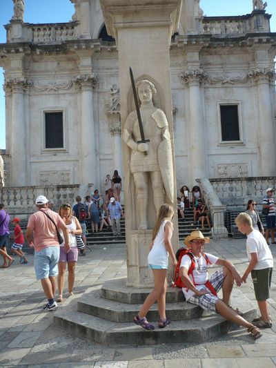 Напротив городской колокольни стоит колонна, посвященная легендарному рыцарю средневековья Роланду. Недалеко от Дубровника, возле острова Локурм, сей храбрый рыцарь наголову разгромил сарацинских пиратов. В 1419 году благодарные жители города установили памятную колонну об этом событии. Колонна является символом независимости Дубровника, а также покровителем торговли горожан. Длина локтя правой руки скульптуры равняется 51,2 сантиметрам, и имеет название – Локоть Дубровника.