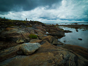 После обеда непогода начала отступать и, пролившись ближе к вечеру сильным, но коротким и тёплым ливнем, подарившим нам замечательную двойную радугу, ушла окончательно. Так что можно было даже немного позагорать. Во время отлива открылся путь на соседние маленькие островки. Погуляли по ним, похавали морошки. А чудики успели снова нарыть червей и уже к вечеру принялись за рыбалку. Сначала долго примерялись, но затем дело пошло, стали таскать одну за другой. Так что на ужин нас ждала отличная нажористая уха. Вечерком настало время выполнения ещё одного пункта из нашего маст-ду листа. Побывать на море, не искупавшись в нём, как-то вовсе не православно. Так что отогрев бока под вечерним солнцем, решили по очереди занырнуть в чистейшие воды славного Белого моря. Полминуты купания, а бодрячок на весь оставшийся день.