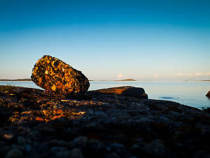 Довольно быстро добрались до бОльшего из Дарьиных островов. Перекур. Дальше нас ждал самый большой перегон по открытому морю, около трёх километров. Погодка сегодня продолжала радовать, но было не особо то и тепло. Добрались до Кузова без проблем, хотя и на адреналинчике. Волны на некоторых участках были очень даже ничего, особенно в тех местах, где ветер встречался с течением. Интерференция, мать её. Зачалив в небольшой бухточке, спрятали лодку в лесу, переобулись и двинули по берегу к северной части острова, откуда по лысому и не очень крутому склону начали подъём. Задумка прогуляться по макушке горы и спуститься с другой стороны острова оказалось глупой и невыполнимой, ибо ближе к вершине всё поросло невысоким и трудно проходимым леском. В общем, толком мы ни черта и не увидели. И поняв, что нужно было чалиться с другой стороны, а ещё лучше вообще плыть к Немецкому Кузову, потихоньку двинули обратно, т.к. время уже поджимало. Тут мы, конечно, пожалели, что не имели связи с Саньком. А то бы можно было задержаться и полазить по острову с других сторон. Но цель достигнута, а это главное. Плыть обратно было уже попроще да и повеселее. На ночёвку остались там же, а оставшуюся часть вечера пинали балду теперь уже все вместе.