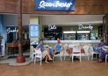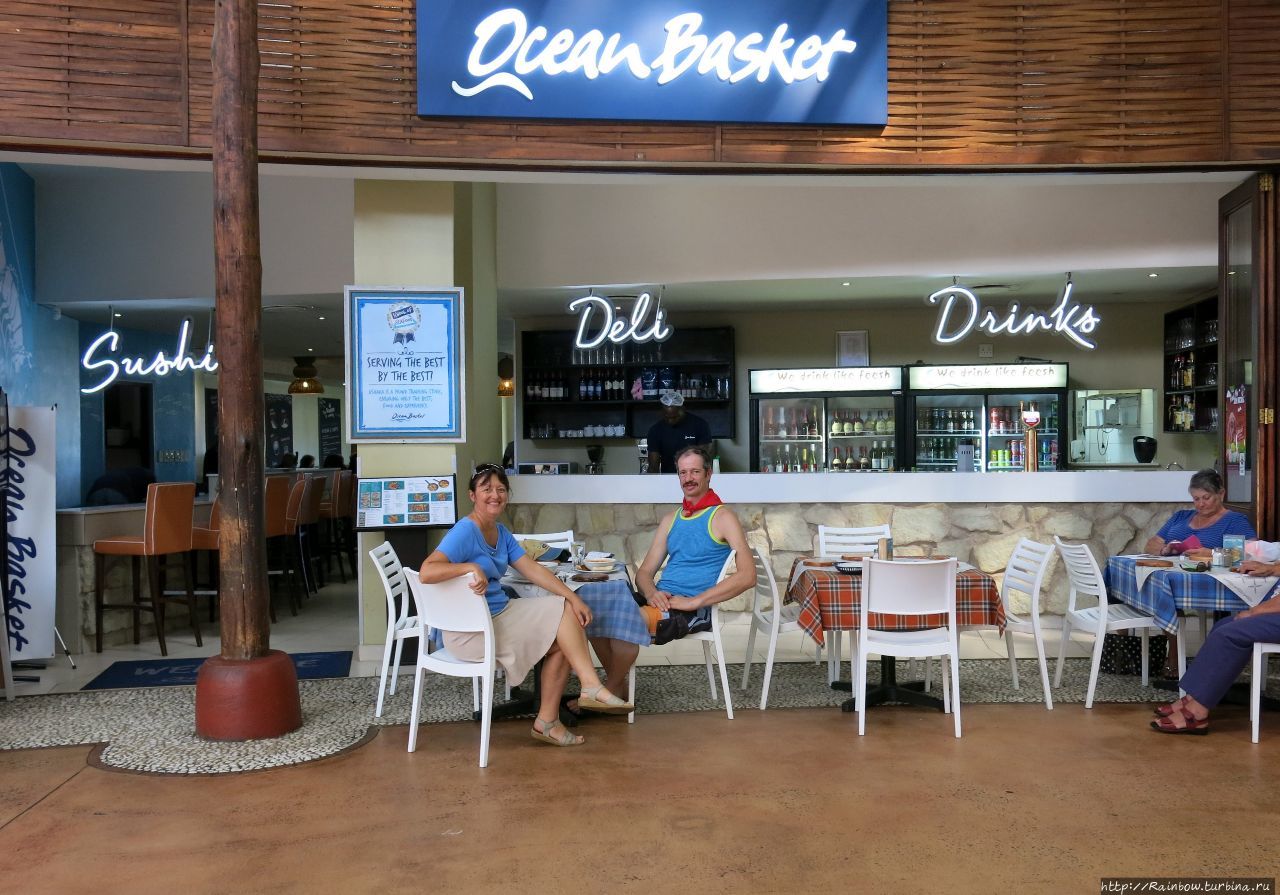 Рядом с акварарком расположено много кафе, время обеденное и нам пора присесть. Выбираем "Океанскую корзинку", кафе, предлагающее рыбу и морепродукты на любой вкус.