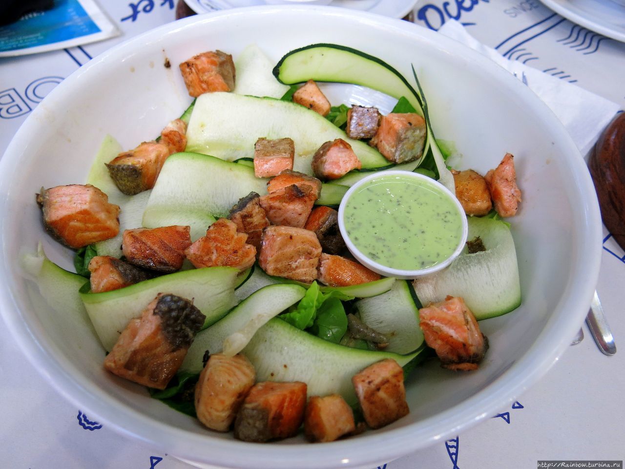 И также теплый салат с печеным лососем и цукини, которым объедаемся. Цены очень умеренные.