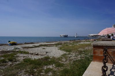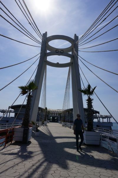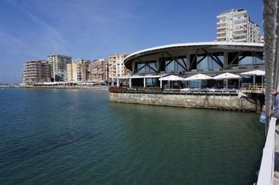 С набережной хорошо виден пешеходный вантовый мост и современное сооружение, которое есть не что иное, как самый известный в Дурресе ресторан «Ventus»
