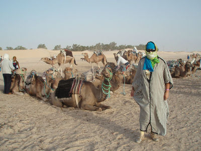 Вечером поехали к пустыне, где нас ждали погонщики и верблюды.