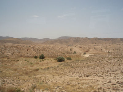 Пейзаж становится однообразно-пустынным, дорога ведёт к Сахаре, вглубь африканского