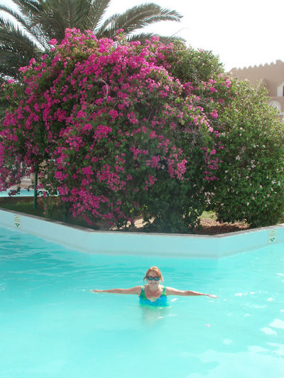 бассейном под высокими финиковыми пальмами. Приятно купаться в бассейне после знойного