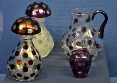 Этот период — время массовой выработки изделий из бесцветного хрусталя и с нацветом, украшенного богатой алмазной гранью, а также посуды из простого и молочного стекла, с декором "золотая чеканка".