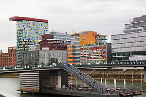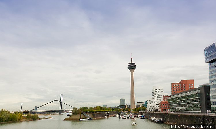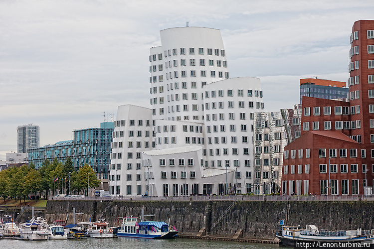 От "пьяных домов" проходим чуть вперед, в бывший порт. Сейчас этот район называется MedienHafen ( Медийная гавань). Из унылого портового района Медийная Гавань превратилась в модное место, концентрацию архитектурной фантазии.