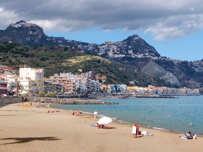 Вид на Таормину и Кастельмолу из Джардини Наксоса тоже просто роскошный! Над голубым морским заливом возвышаются две горы, — как две ромовые бабы, облитые "глазурью" городских крыш.