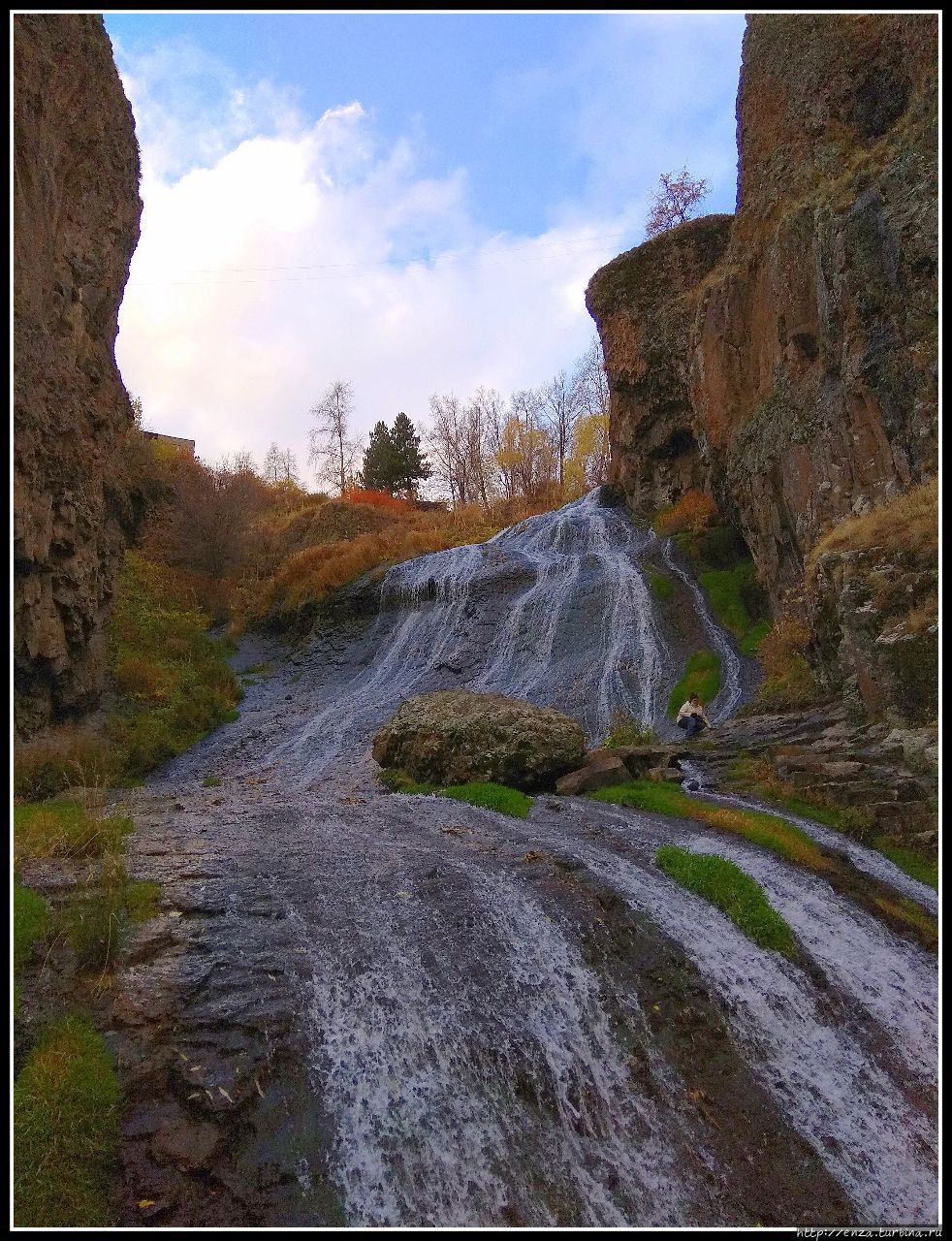 Туристы, чтобы сделать эффектные снимки, обычно поднимаются к большому камню, находящемуся примерно посередине водопада.