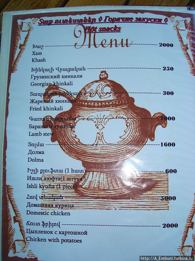 По ценам замечу, муж мой несколько дней назад вернулся из России и теперь постоянно сравнивает цены. Я в России не была лет 5, поэтому принимаю на веру его слова, что за такое чаепитие на моей родине мы бы заплатили тыщу рублей! А тут за 4 чая и 4 пирожных — 4500 драм, что равноценно 350 рублям.