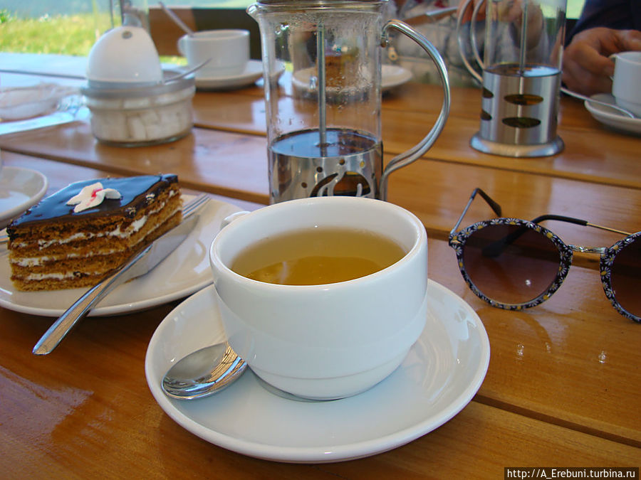 Нам подают чай с пирожными. Ассортимент чая тут просто восхитительный. Кроме огромного выбора заморских чаев с креативными названиями, в меню есть также армянские чаи, травы для которых собирают тут же, на горке и вокруг нее.