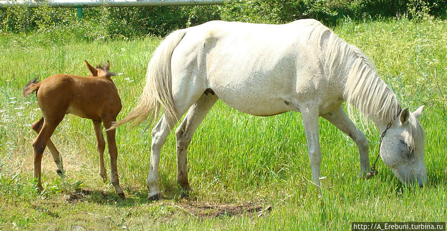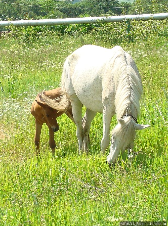 В этом году мы каждый день наблюдаем за белой прекрасной лошадью и ее рыженьким жеребенком. Мы увидели их в первый же день после рождения малыша — он не ходил, лежал в траве, а мама при нашем приближении неслась к нему (хотя и отходила всего на пару шагов), вылизывала его и была готова защищать.
