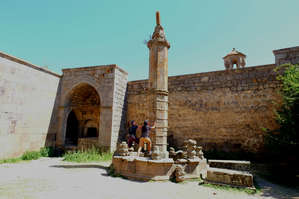 Главное и самое древнее, что здесь доступно сейчас — это глубокое подземелье, в котором злобный властитель четырнадцать лет держал главного армянского святого Григория Просветителя. Это было давно в третьем веке. По лестнице можно спуститься метров на шесть вниз и посмотреть на древнюю тюрьму. Собственно, я вам этого делать не советую, ничего особенного в подземелье нет, а на лестнице, которая идет по узкому кривому тоннелю, постоянно застревают полные женщины и сильно истерят. Почему то они входят лучше чем выходят. Здесь здорово играть в Вини Пуха и вообще худеть.
