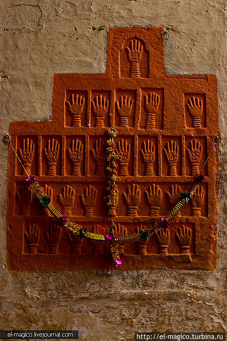 14. Это отпечатки рук жен Махараджей Джодхпура. Знак, который оставляют во время ритуала Сати — самосожжения вдовы. Именно в Раджастане до сих пор распространено, не взирая на уголовное преследование семьи вдовы, всех участников церемонии и даже зевак, если полиция поймала на месте.