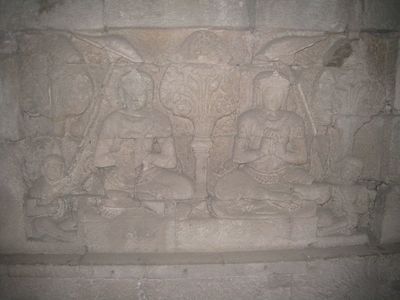 Это фигуры Бодхисаттв в позе вара-мудры (жертвоприношение) когда-то сидели рядом с центральной статуей Будды. Судя по цветку, который они держат в левой руке, это Авалокитешвары, и (возможно) Vajrapāṇi. В нишах справа и слева тоже красивые рельефы безмятежно спокойных мужчин и женщин.