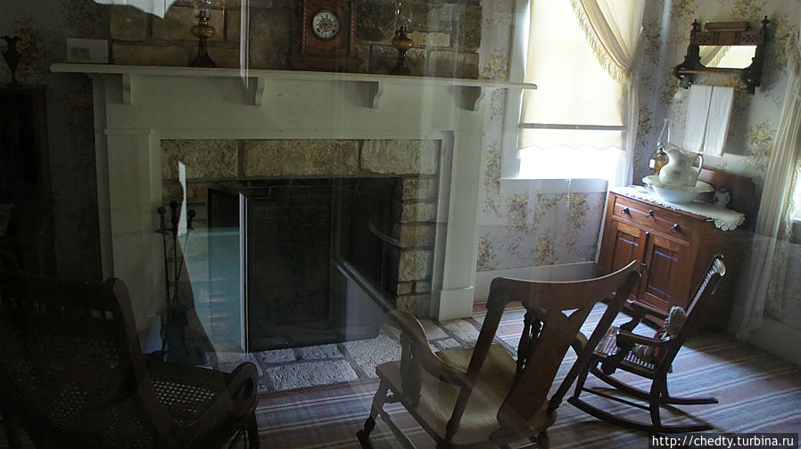 Никакого специального мемориала в парке ставить не стали, просто оставили все как было при Джонсоне. Это дом где он родился. Организаторы как то явно застеснялись при оформлении. Посмотрите на фотографию, вот она семейная идиллия перед камином. Это кресло папы, это мамы, а вот будущего президента. Ребята, а где еще пять для сестер и брата? Нет конечно все это выглядело не так, здесь была веселуха.