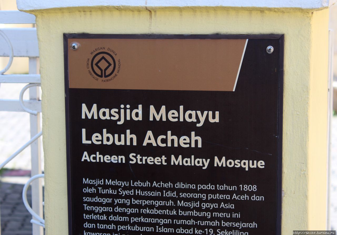 На официальном сайте whc.unesco.org/en/list/1223 в них не выделены отдельные объекты, как, например в Салониках, или Трире, а указаны "исторические центры" городов. Но, гуляя по Джоржтауну я регулярно обращал внимание на характерные таблички коричневого цвета с эмблемками ЮНЕСКО, указывающих на четыре главных храма города, принадлежащим четырем религиям — кафедральный католический собор, мусульманская мечеть, индуистский храм и даосский китайский храм. Первым на пути мне попалась Malay Mosque (main) Lebuh Acheh — главная мечеть города и всего региона острова Пенанг.