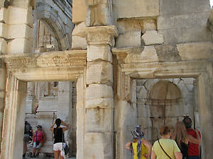 Справа от фасада библиотеки находится монументальный вход в агору в виде Ворот Мазавса и Митридата. Эти ворота построены в честь императора Августа и его жены Ливии в IV в. н.э. двумя рабами, отпущенными ими.