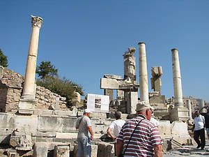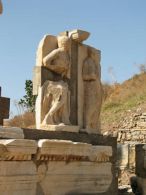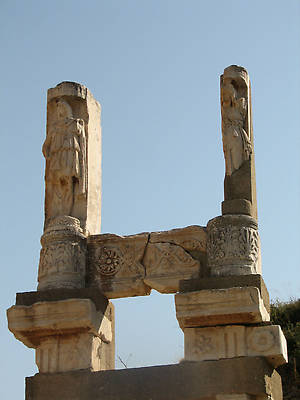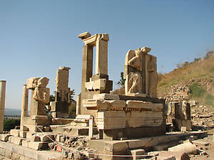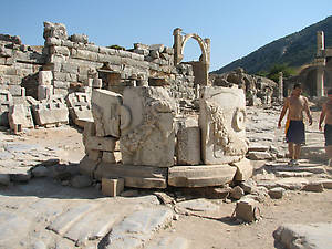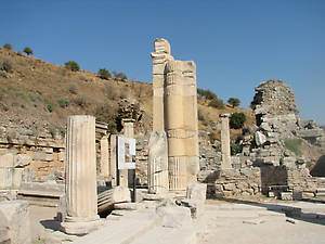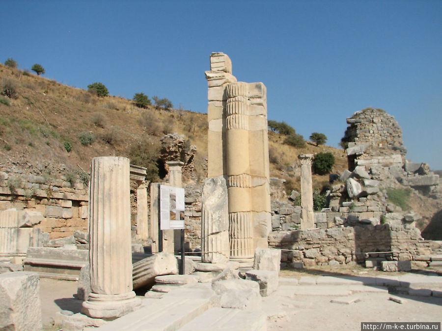 С правой стороны от меня находилась площадь , а на ней храм Домициана. Это было двухэтажное сооружение, стоящее на мощных колоннах. Построен храм в 81-96 г.н.э.. и являлся первым храмом, построенным в Эфесе в честь римского императора. Его окружала великолепная колоннада, внутри была установлена гигантская статуя императора и подковообразный жертвенник. Позже был переосвящён в честь Веспасиана, отца Домициана, построившего в Риме всемирно известный Колизей.