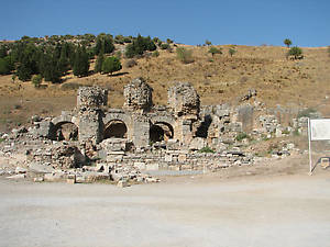 Сразу после ворот Геракла с левой стороны можно увидеть интересное сооружение — три колонны , а за ними на пьедестале барельеф. Это сооружение в бытность той эпохи было фонтаном и имело прямоугольную форму и название Гидреон.