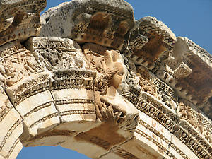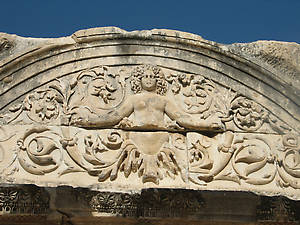 Две центральные колонны поддерживают легкую арку со скульптурным лицом Фортуны – покровительницы города и самой любимой богини Адриана. Узоры, обрамляющие ее изображение, устремляются дальше.Второе помещение храма увенчана барельефом головы женщины. О том, кого изображает помещенная в ней женская фигура, полемика ведется уже много лет, но большинство спорщиков утверждает, что это горгона Медуза. В греческой мифологии так именовалась одна из трех крылатых сестер, обладательница настолько ужасной внешности, что всякий, кто осмеливался взглянуть на нее, рисковал обратиться в камень. В отличие от сестер боги не наделили ее бессмертием, чем однажды воспользовался Персей, сумевший отрубить жуткую голову. Однако и в таком виде она, к изумлению героя, продолжала превращать в камень все, на что падал ее мертвый взгляд. По обе стороны от Медузы находится фриз, на котором изображена история основания Эфеса. В храме трудно найти место, которое не был бы покрыто надписями и изящным орнаментом.
