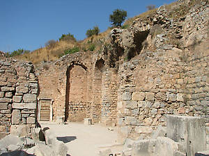 Храм Адриана, не отличаясь ни размерами, ни богатым убранством, все же относится к шедеврам античного зодчества. Построен он в 118 году н.э. богатыми гражданами города в честь Адриана, Артемиды и всего города в целом. Когда-то перед его монументальным входом стояли статуи. Сегодня от них остались одни пьедесталы, однако по надписям можно определить, что они изображали последователей Адриана, кстати, не столь выдающихся: Диоклетиана (284–305), Максимиана (285–305), Констанция (293–306), Галерия (293–311).