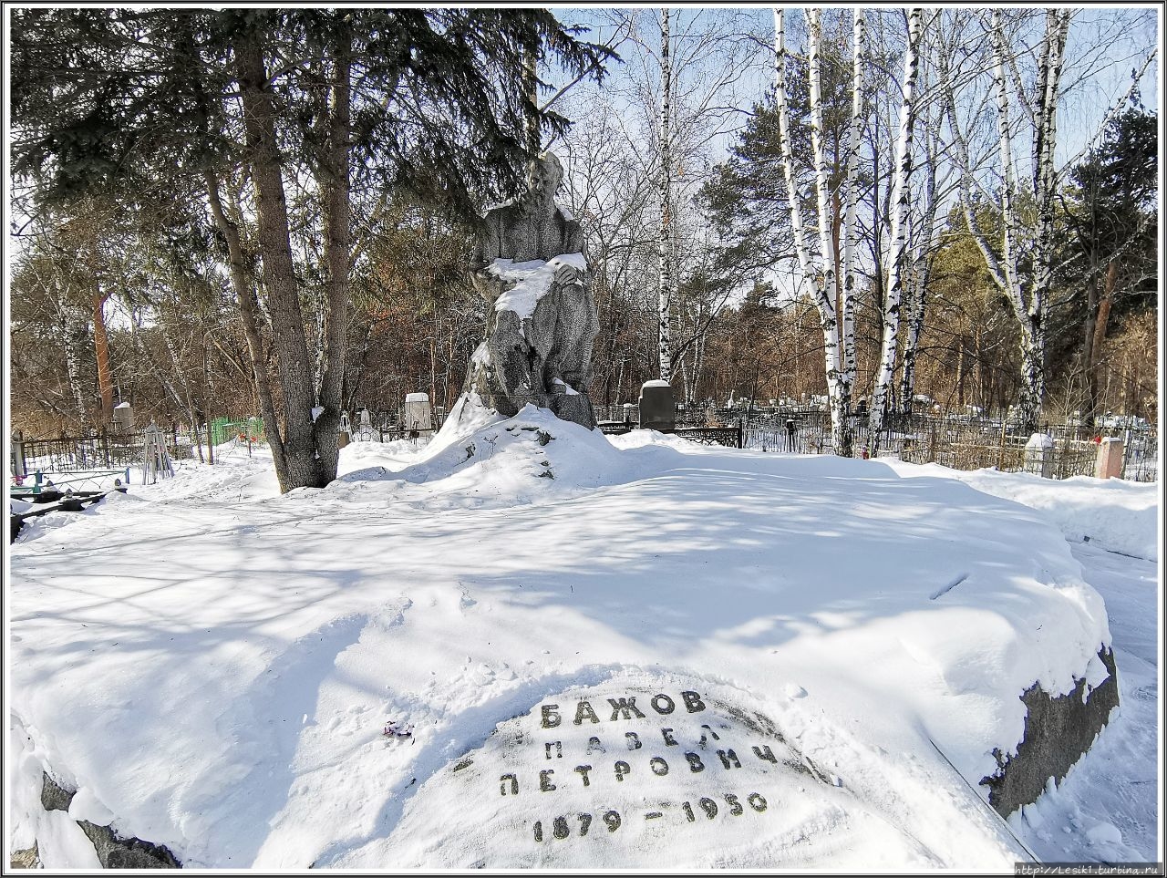 Могила писателя находится на холме, на центральной аллее кладбища. В 1961 году на могиле установлен гранитный памятник. Авторы памятника — скульптор А. Ф. Степанов и архитектор М. Л. Минц. Писатель изображен сидящим на камне в спокойной, непринужденной позе, руки лежат на коленях, в правой руке — курительная трубка. Высота памятника — 5 м. У подножия его на каменной плите высечена надпись «Бажов Павел Петрович. 1879 — 1950».