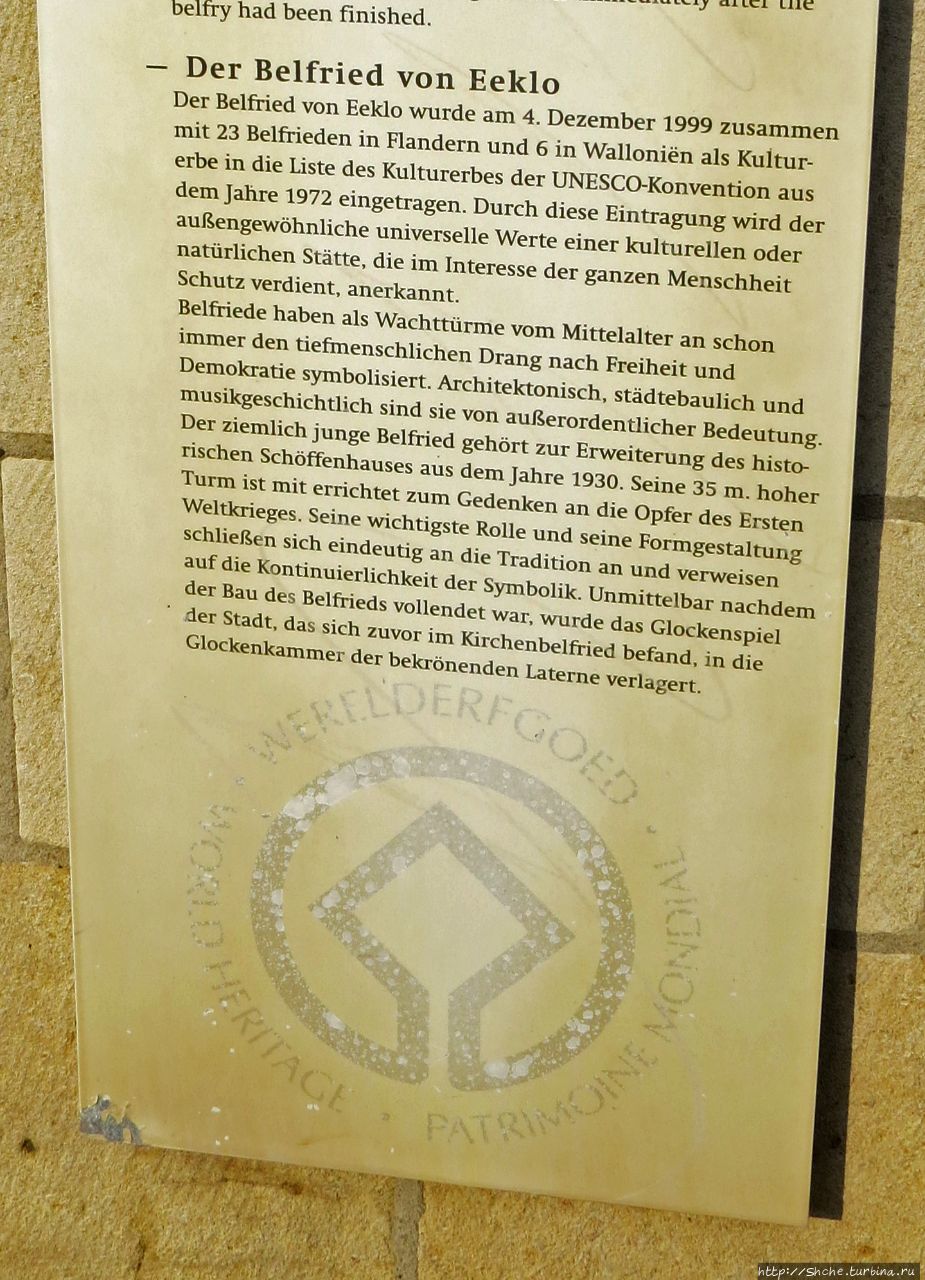 Вот сайт города Eeklo, с одной стороны с гордостью указывает, что ратуша и колокольня являются частью Всемирного наследия, а с другой стороны скромно намекают: