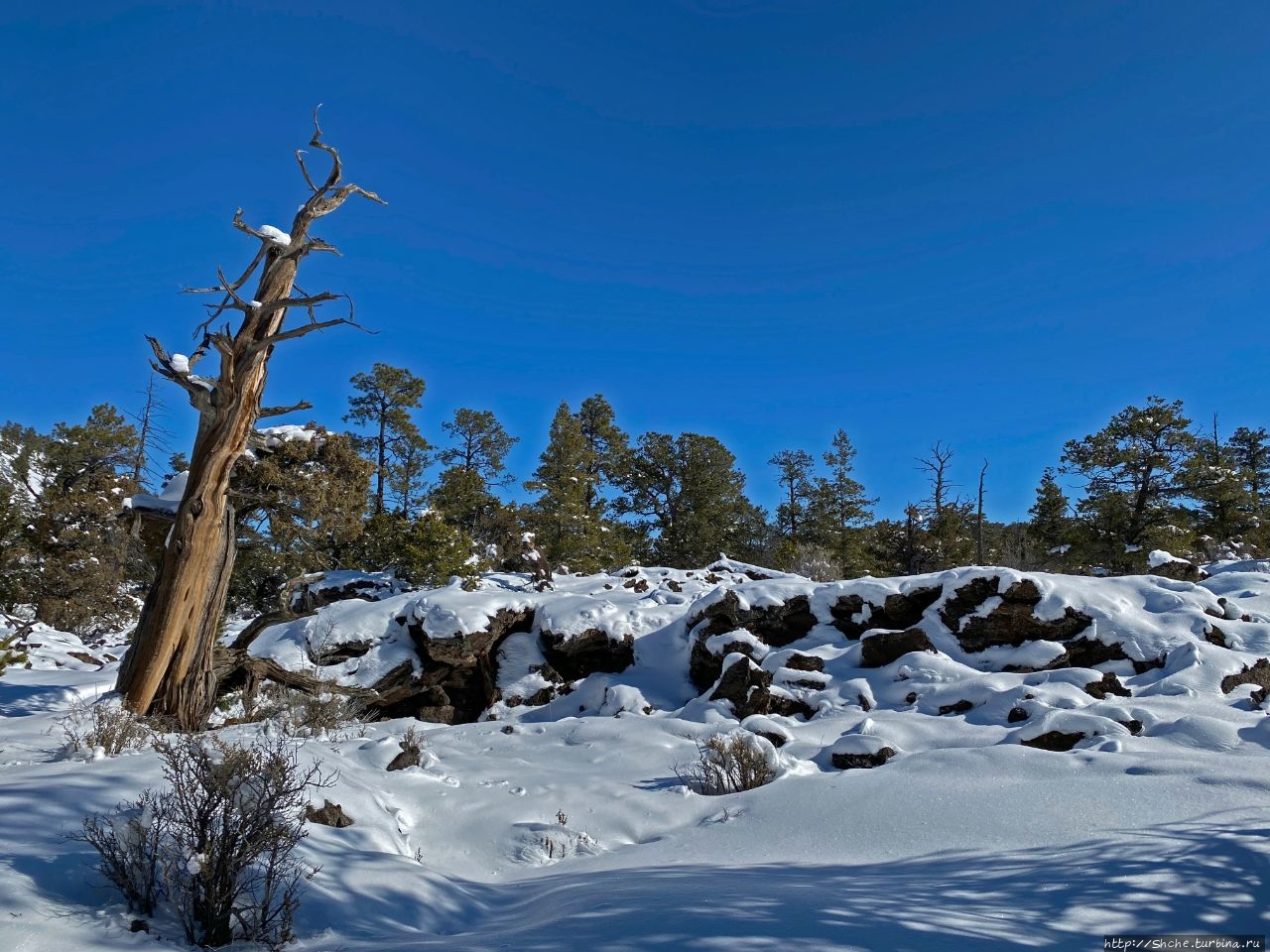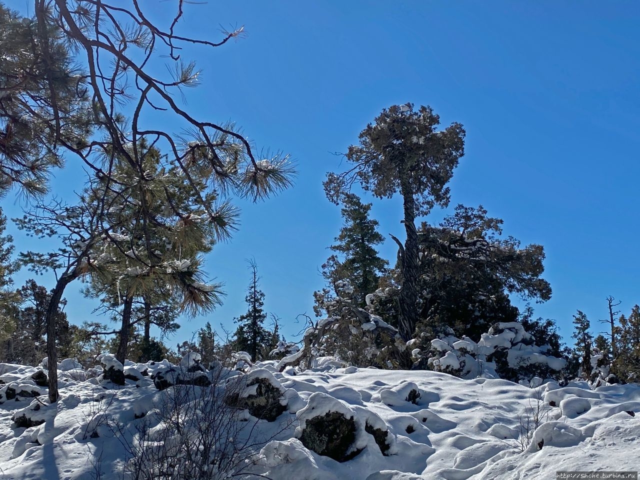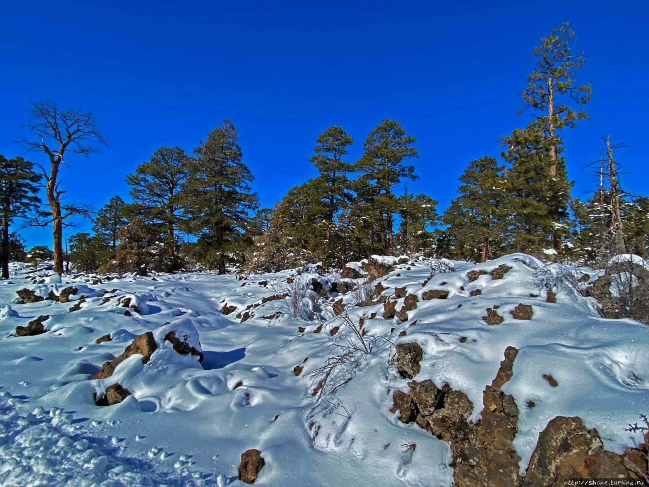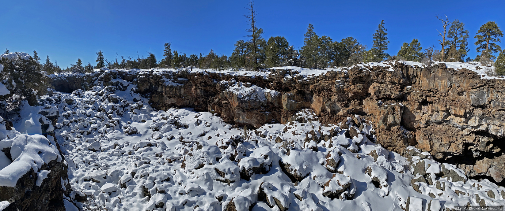 Бандера в снегу - шлаковый вулкан в Нью-Мексико... ... нам оставалось совершить еще одну короткую, как нас сориентировали в инфоцентре, не более получаса туда-и-обратно, прогулку к Ледяной пещере...