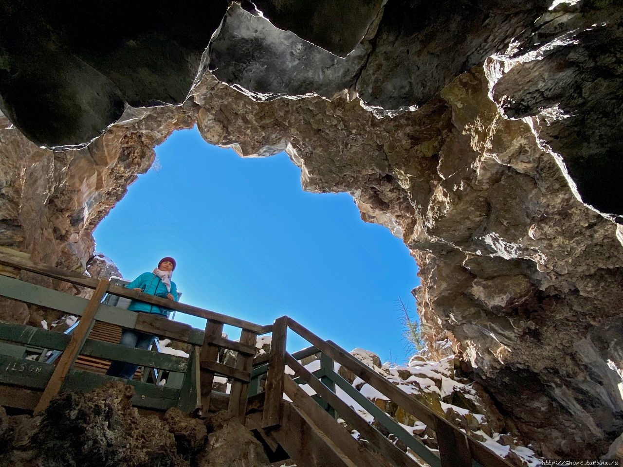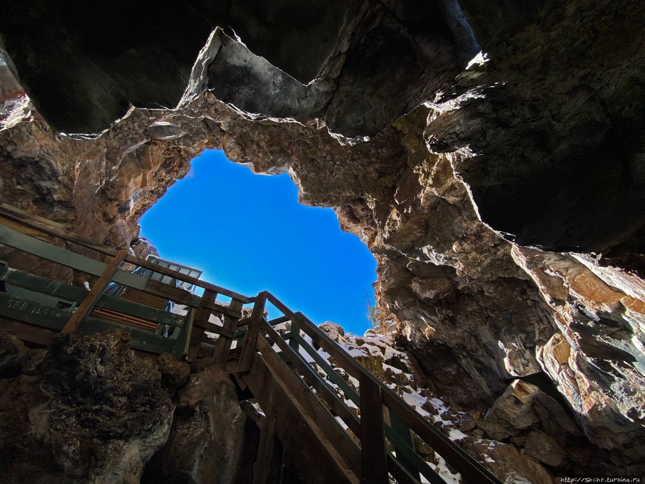 Жаль, я не нашел информацию, какова глубина пещеры. На официальном сайте указали, что глубь ведет лестница на 70 ступенек.