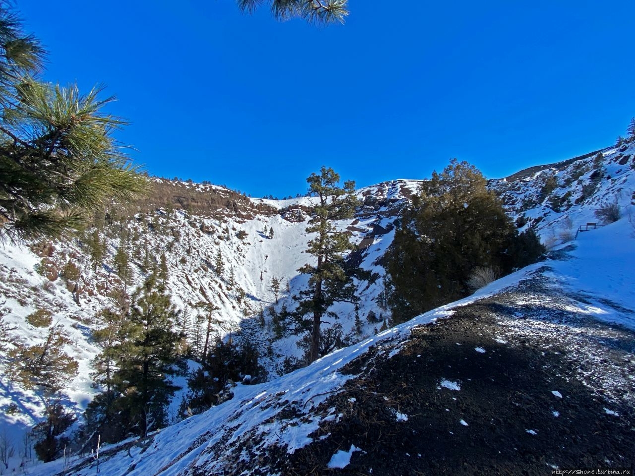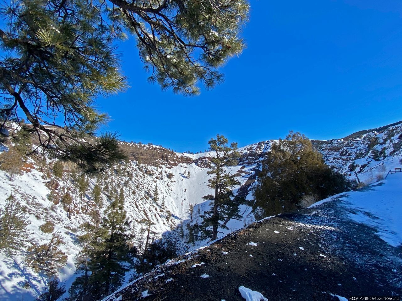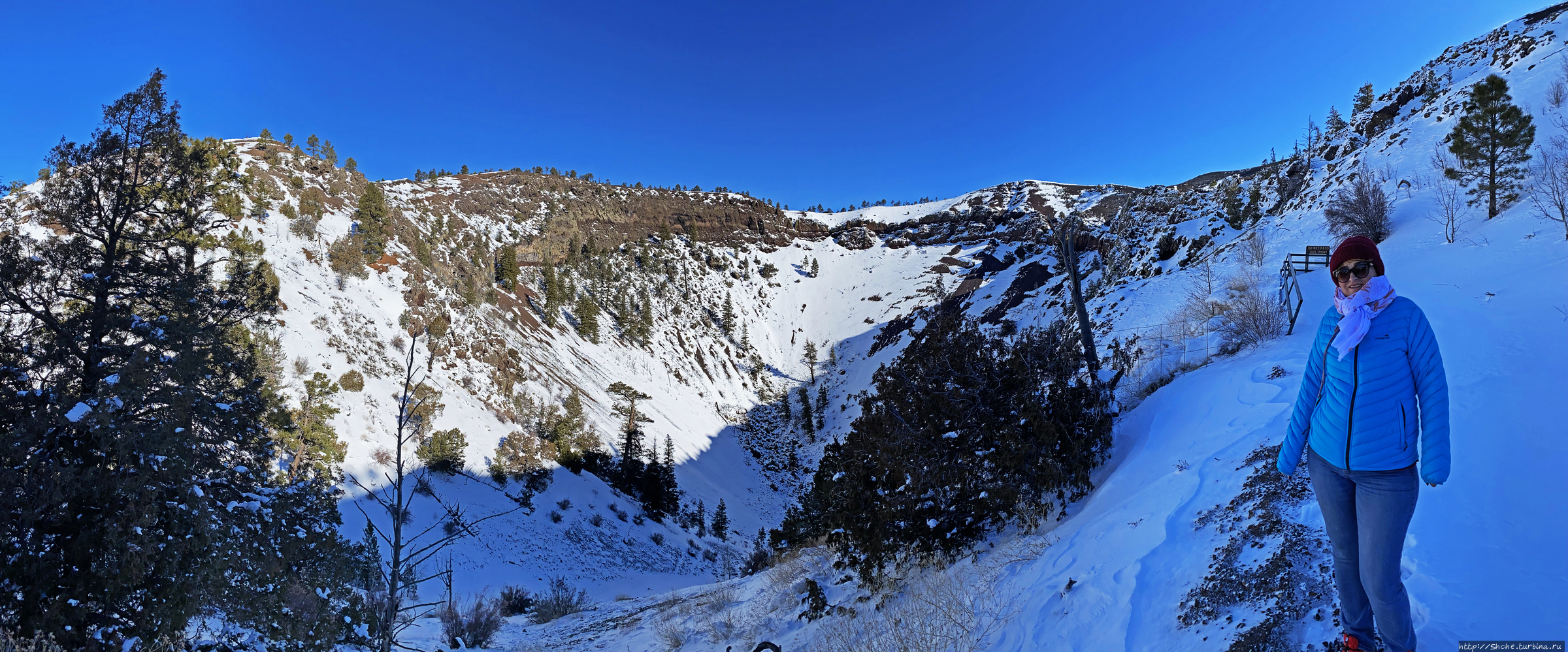 Красочный буклет из отеля, как и официальный сайт предлагают прогуляться вокруг кратера и заглянуть внутрь вулкана с самой верхней точки. К сожалению, зимой такая опция недоступна. На фото ниже за спиной у жены видно, что тропа дальше не прочищена и дорога по краю кратера закрыта деревянными ограждением.