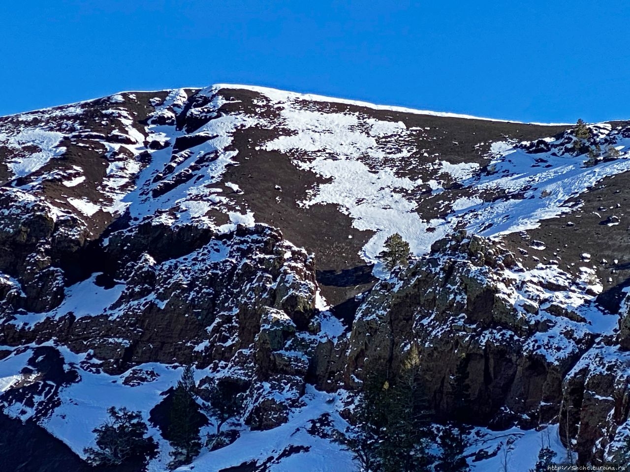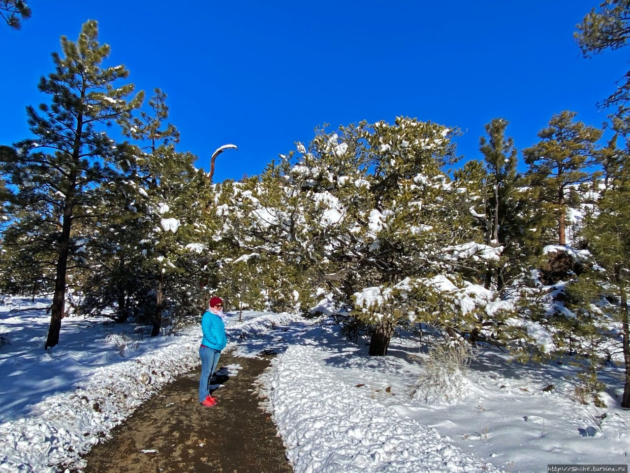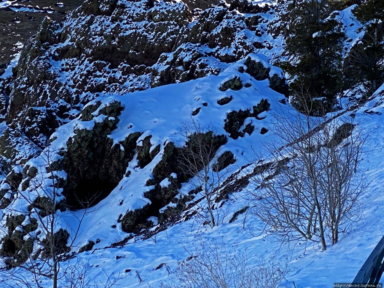 Красочный буклет из отеля, как и официальный сайт предлагают прогуляться вокруг кратера и заглянуть внутрь вулкана с самой верхней точки. К сожалению, зимой такая опция недоступна. На фото ниже за спиной у жены видно, что тропа дальше не прочищена и дорога по краю кратера закрыта деревянными ограждением.