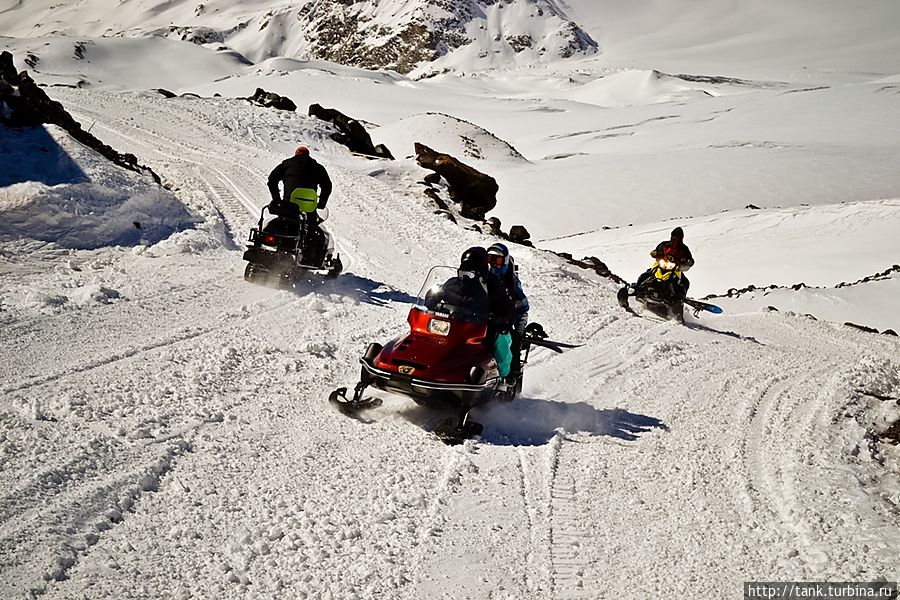 Когда-то со станции Мир можно было подняться на однокресельной канатной дороге до станции Гара-Баши (3780 м), но сегодня она не работала. Вообще есть несколько вариантов подняться выше станции Мир, во-первых, это пешком, сотни, а возможно и тысячи альпинистов ежегодно покоряют двугорбый Эльбрус, но это скажу вам ой как не просто. Следующие два варианта, которыми мы и воспользовались это въехать на Эль на снегоходе или ретраке.
