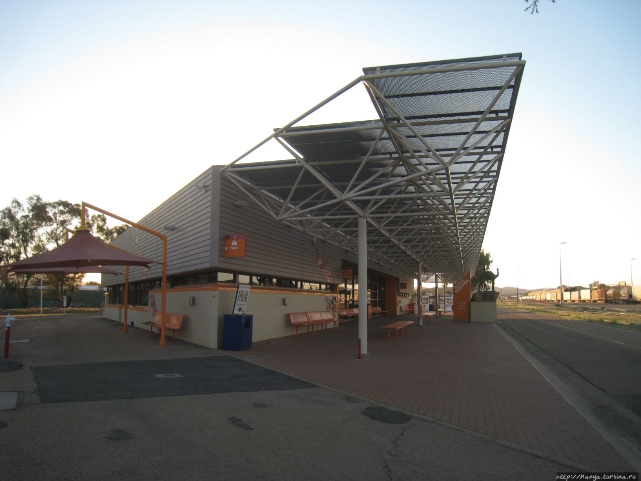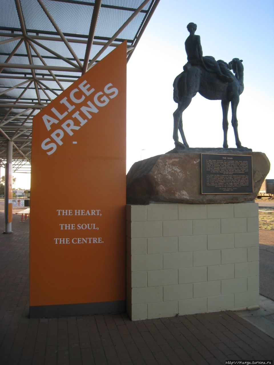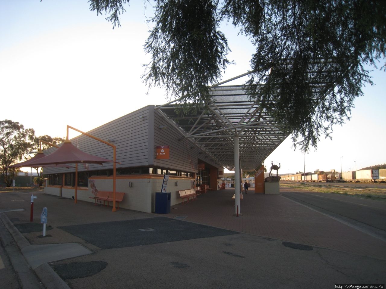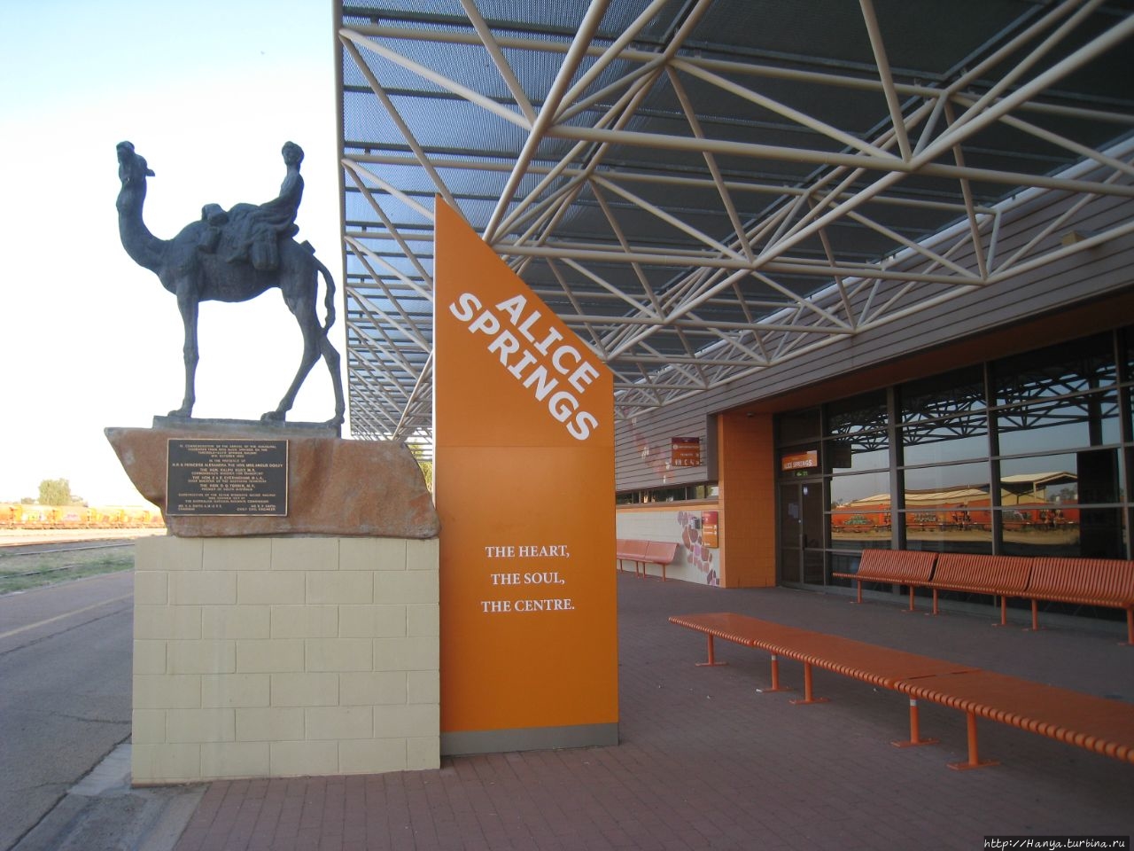 Вокзал на станции Алис-Спрингс небольшой, перед вокзалом со стороны путей установлена фигурка верблюда с погонщиком,