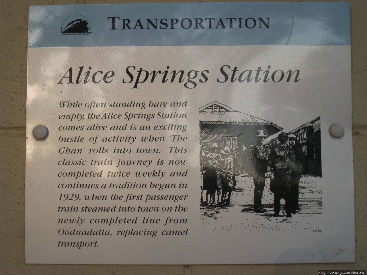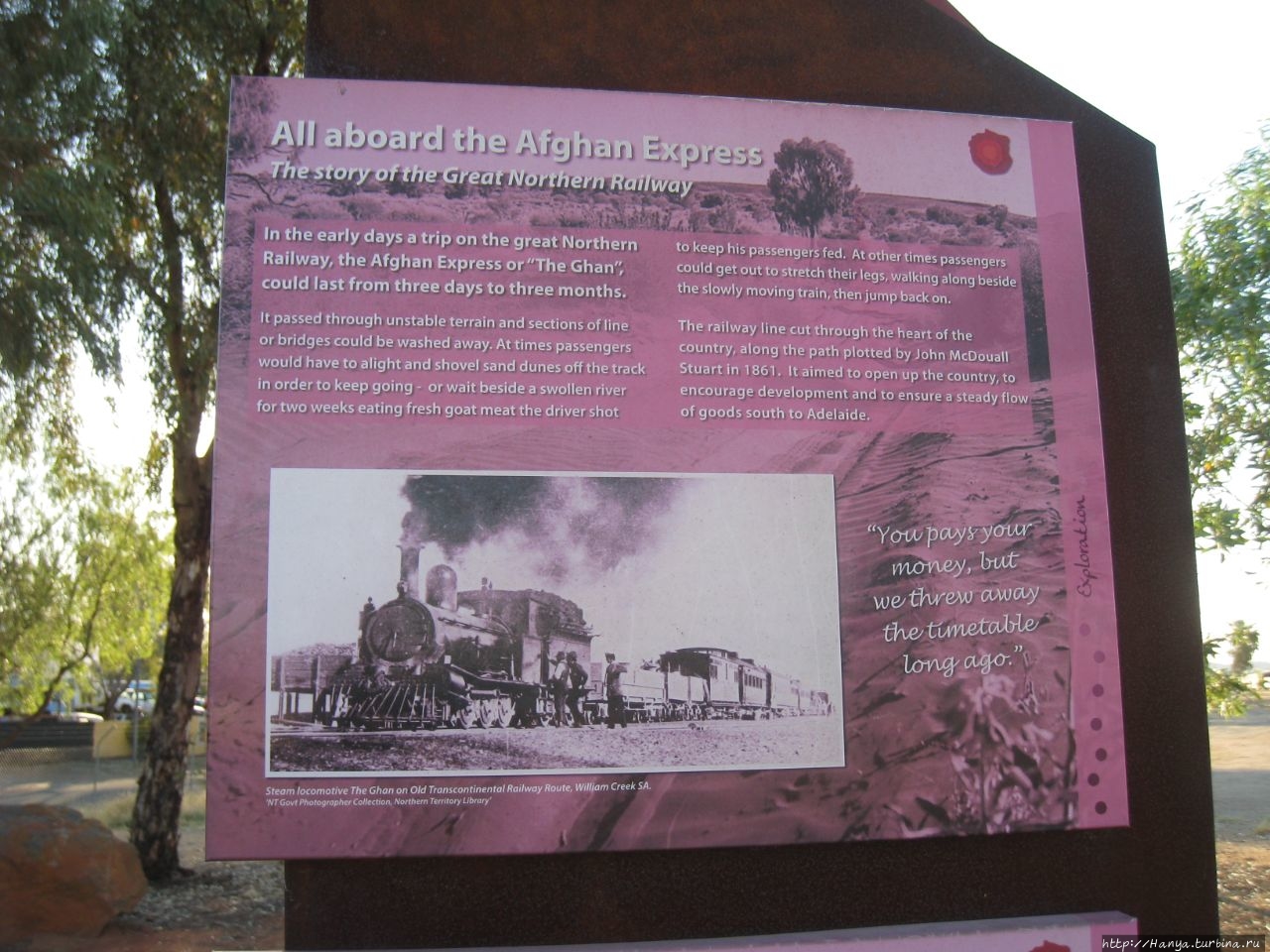 История создания Afghan Express, или поезда Ган (Ghan), удостоилась нескольких стендов с тем, чтобы показать, как, для чего и какими усилиями она была построена. Город Алис-Спрингс рос медленно, да и понятно, кто добровольно заставит себя жить в месте, настоль отдаленном от цивилизации, да еще и с таким перепадом температур. Для передвижения сюда были специально доставлены импортированные из Афганистана верблюды, пригодные для поездок по окружающей пустыне.