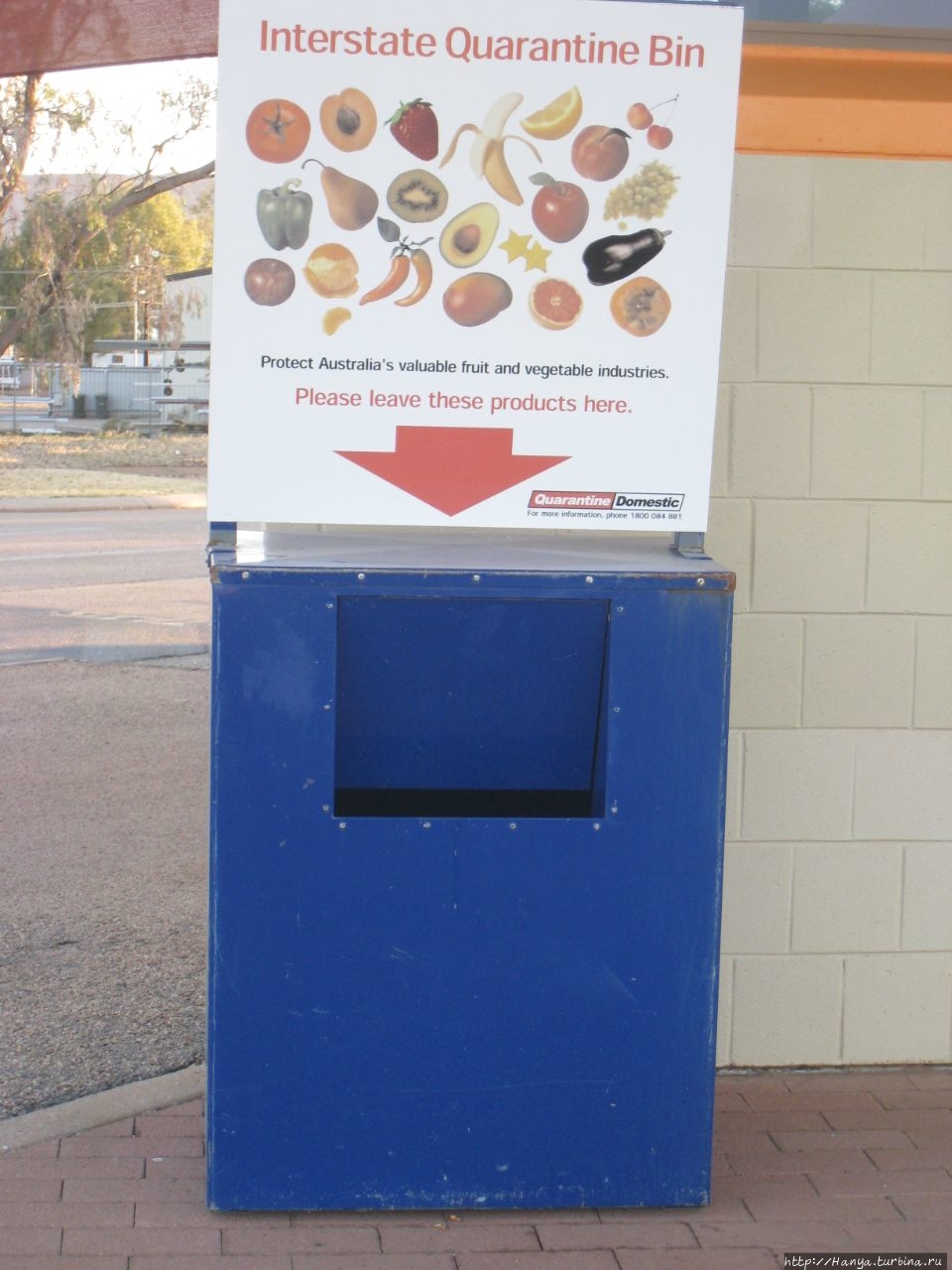 Обычно пустынная станция оживает с прибытием сюда поезда и первое, что встречает пассажиров это большая урна и плакат, призывающий защитить уникальность фруктов и овощей Австралии.