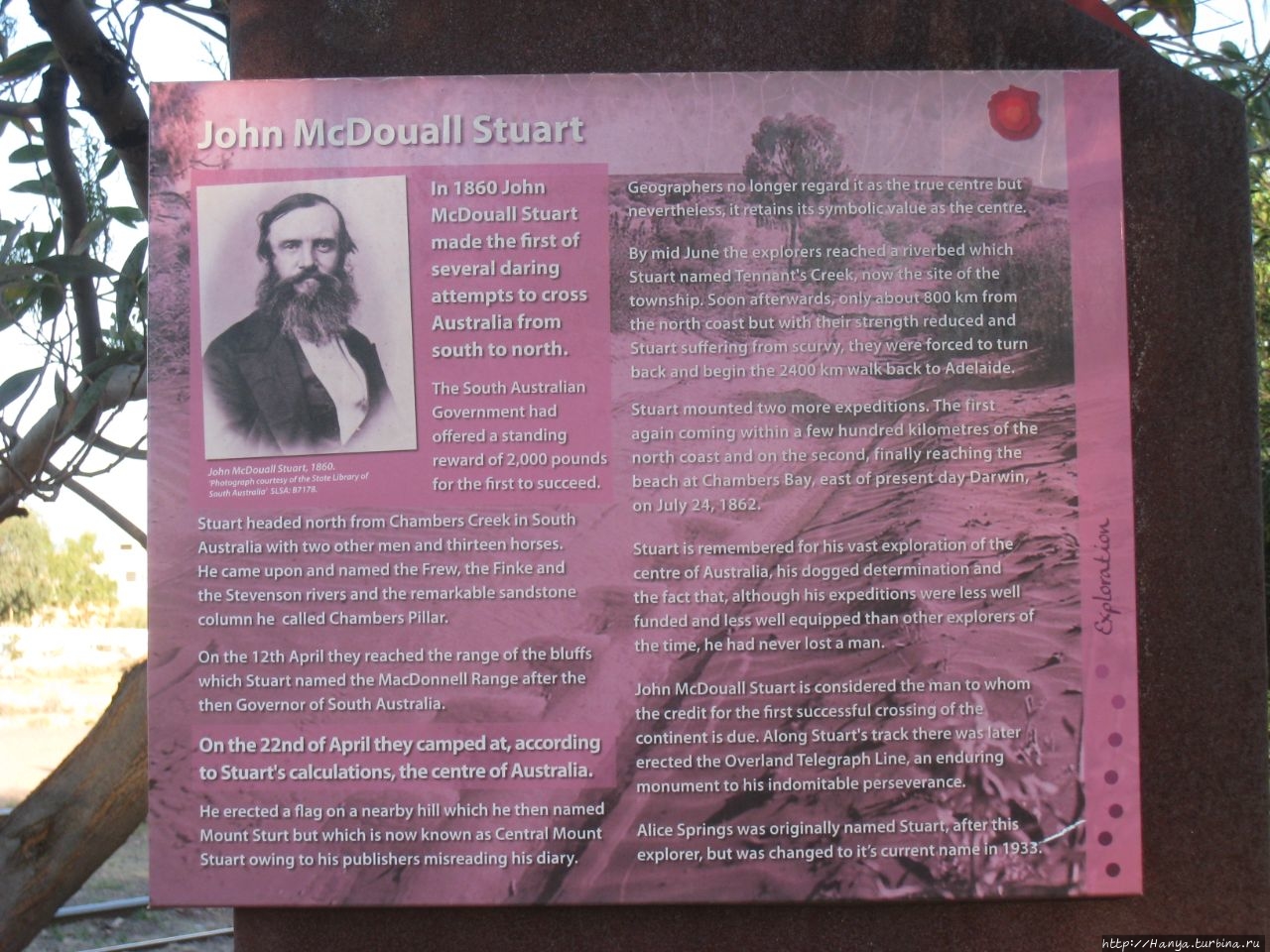 Один стенд был посвящен Стюарту, который первым осуществил попытку пересечь Австралию с юга на север в этих местах. Было предпринято несколько безуспешных попыток, даже была установлена премия первому, кто проделает этот путь. Позднее здесь была проложена автомобильная дорога (нынешний Стюарт Хайвей) и железная дорога. На караванном пути, связывающем север и юг австралийского континента, Джон Мак-Доул Стюарт обнаружил непересыхающий источник воды Алис-Спрингс, где и был основан поселок для обслуживания телеграфной станции. В 1929 году сюда с юга страны, из Аделаиды, была проведена железная дорога.