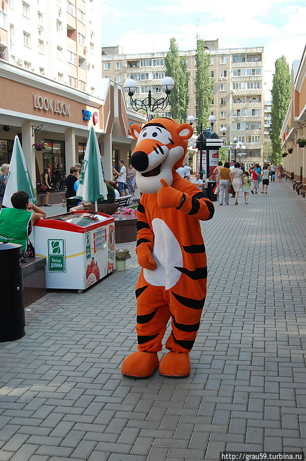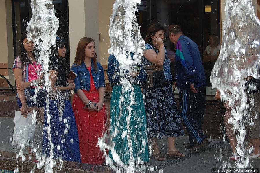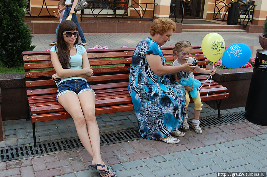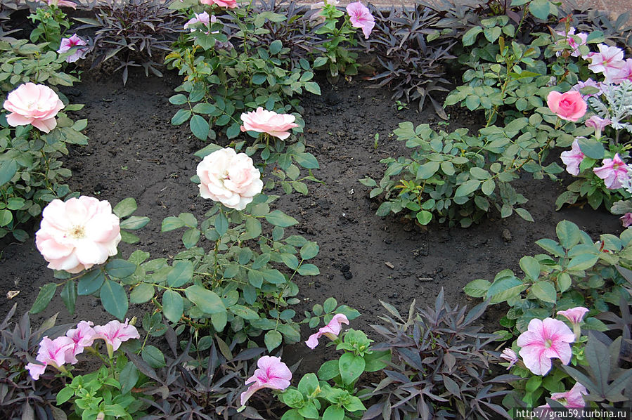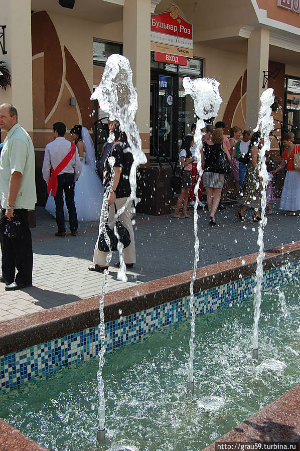 и прогуливаются весёлые сказочные герои.Люди фотографируются везде: возле фонтанов, памятника, вскарабкиваются на гору роз.