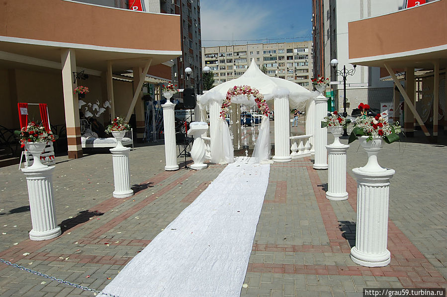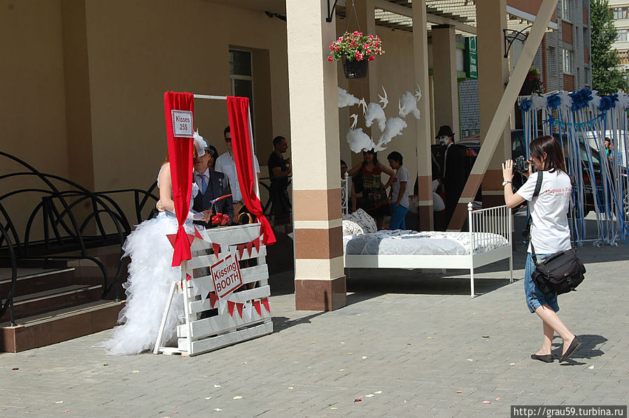 и расположилась огромная кровать для молодоженов.И среди этого людского потока множество людей с фотоаппаратами и видеокамерами.