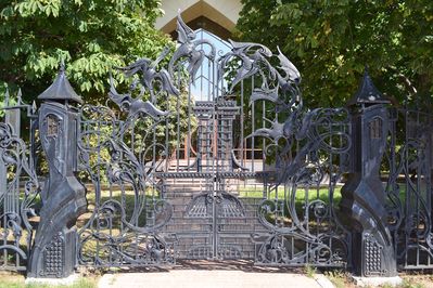 А на калитках по обе стороны от ворот изображена царевна-лебедь из мультфильма "Сказка о царе Салтане" (1984).