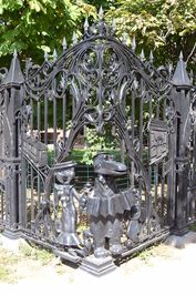 На ограде — сцена похищения Жар-птицы.Мультфильм "Гуси-лебеди" (1949) представлен не только на ограде, где изображена сцена, где Маша вместе с братцем Ванечкой прячутся под яблоней.